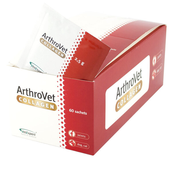 Vet Expert ArthroVet Collagen е модерна хранителна добавка, специално разработена за поддържане на здравето на ставите и сухожилията при кучета и котки. Продуктът е особено подходящ за млади, растящи животни, както и за активни, спортни кучета, подложени на интензивно натоварване.