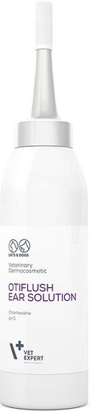 Vet Expert OtiFlush Ear Solution е течност за ирригация на ушите при кучета и котки. Има оптимално pH 5, което го прави подходящ за случаи на отит екстерна и подготвка преди терапия. Формулата включва хлорхексидин диглуконат с антисептично действие, активиран от TRIS-EDTA за стабилност на микрофлората.