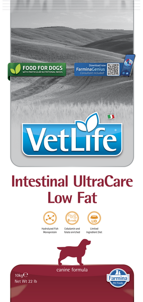 Farmina Vet Life Intestinal UltraCare Low Fat е пълноценна диетична храна за кучета за намаляване на риска от смущения в чревната непропускливост, компенсиране на лошо храносмилане и екзокринна панкреатична недостатъчност.