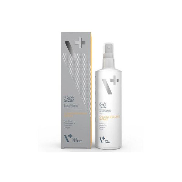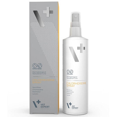 Vet Expert Chlorhexidine Spray е дерматологичен продукт за локално приложение при кучета и котки, предназначен за третиране на кожни лезии с бактериален произход. Спреят съчетава мощни антисептични съставки с успокояващи и регенериращи компоненти.