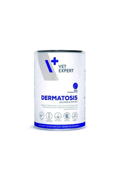 Пълноценна и балансирана диетична храна за възрастни кучета, чието прилагане намалява непоносимостта към съставките и хранителните вещества и подпомага функциите на кожата при дерматози и прекомерен косопад. Мокра храна за кучета Dermatosis Salmon & Potato съдържа подбран, силно смилаем източник на животински протеин (сьомга ). Без зърно – nНе съдържа зърнени храни, които биха могли да бъдат източник на потенциални алергени към растителни протеини. Източникът на въглехидрати в диетата са картофите, които са лесно смилаеми, а протеинът, който съдържат, няма алергенни свойства. Храната съдържа добавка на есенциални омега-6 и 3 мастни киселини, които подпомагат правилните функции на кожата и подобряват качеството на козината.