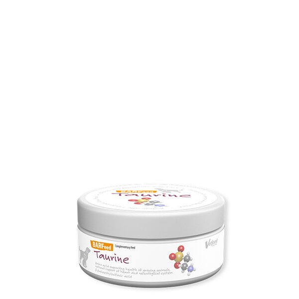 VETFOOD BARFeed Таурин (таурин) е сяра аминокиселина, която се среща в тялото предимно в свободно състояние. Той участва в много процеси, но най-важната му функция е да поддържа сърдечния мускул за правилното му функциониране и правилното развитие на централната нервна система и ретината. Правилното съдържание на таурин в храната определя правилните репродуктивни функции при женските котки и растежа и развитието на котенцата. Тауринът също така подпомага храносмилането на хранителните мазнини, като създава жлъчни соли.