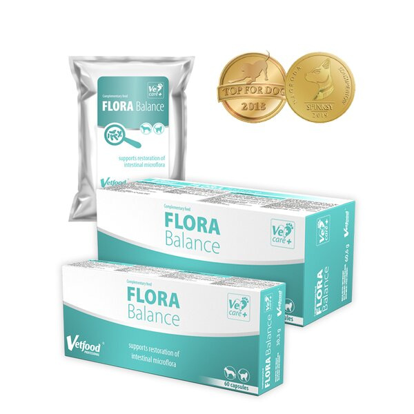 VetFood Flora Balance е висококачествен синбиотик (комбинация от пробиотик и пребиотик), създаден за поддържане на здрава храносмилателна система при кучета и котки. Този продукт е незаменим при състояния на дисбактериоза, причинени от антибиотична терапия, стрес, промяна в диетата или стомашно-чревни заболявания.