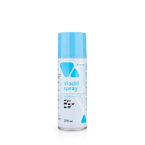 Антисептичен спрейСъдържание на активната субстанция и ексципиентите:Chlorhexidine gluconate ... 250 mgMethylrosaline chloride ... 40 mgВидове животни, за които е предназначен:Всички домашни животни.Показания:Антисептичен спрей при локални кожни лезии, панарициум, операционни рани, охлузвания, одрасквания, порезни и ухапни рани,изгаряния и за дезинфекция на пъпната връв.Дозировка и начин на приложение:Да се разклати преди употреба. Мястото на третиране се почиства от гнойни и ексудативни материи. Напръскайте от разстояние 20см. Повторете третирането след 6 до 12 часа. Извършват се максимум 6 апликации.Флакон от 200 мл.