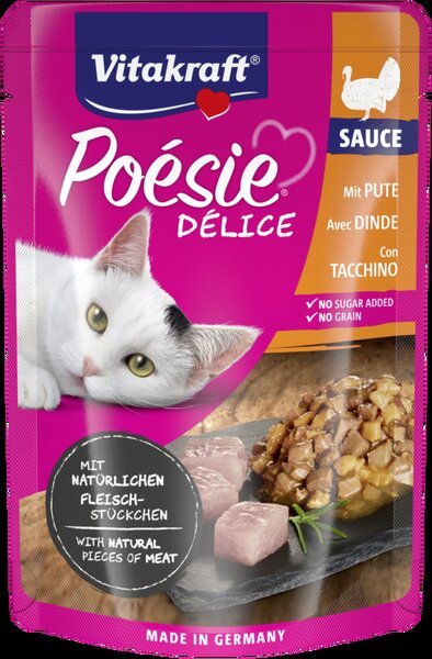 Чиста наслада със сочни пуешки гърди в изобилие от вкусен сос. Неустоимо изкушение за всяка котка! Произведено в Германия.