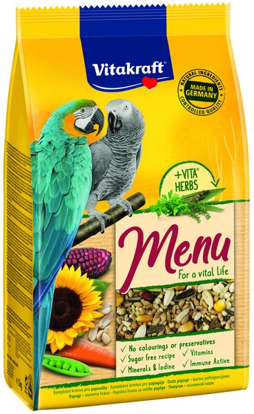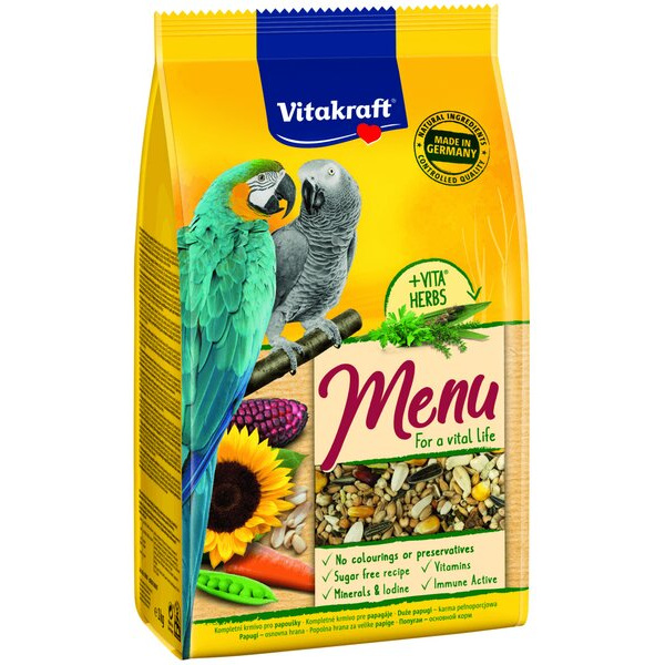 МЕНЮТО на Витакрафт за големи папагали е доказана пълноценна храна, съдържаща висококачествени семена, ядки, червена царевица и парченца морков, за пълното подсигуряване на папагалите с всичко, което им е необходимо. Балансираната хранителна смес е не само вкусна за птиците, тя осигурява всичко, от което те се нуждаят, за да живеят в добро здраве.