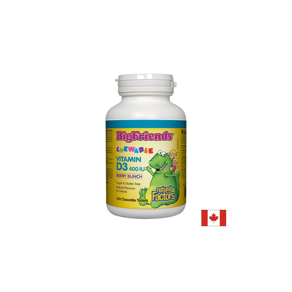 Витамин D3 Big Friends за деца от Natural Factors, Canada е чудесен естествен източник на витамин „слънце”, който е от изключително значение за изграждане на здрави кости и зъби. Този витамин е много подходящ за прием от деца, тъй като е под формата на малки дъвчащи таблетки със страхотен плодов вкус. Витамин D подпомага абсорбцията на калций и фосфор и така насърчава по естествен начин здравословния детски растеж.