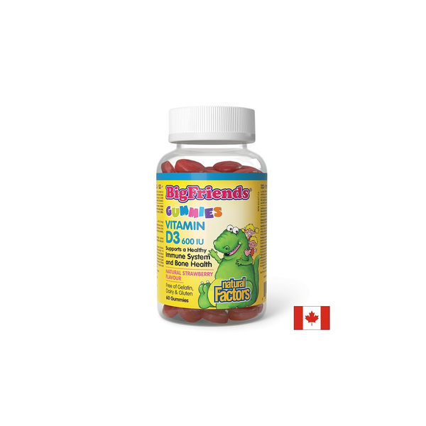 Витамин D3 гъми за деца 600 IU от серията Big Friends на канадската компания Natural Factor e висококачествен източник на витамин D, под формата на лесни за прием желирани таблетки с вкус на ягода.