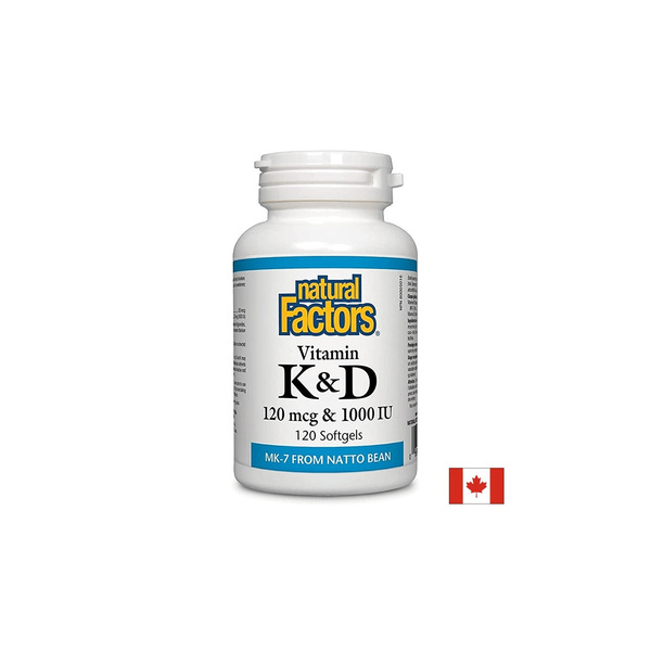 Vitamin K2 120 mcg & D3 1000 IU на Natural Factors съдържа К2 под формата на менахинон-7 (МК-7), получен при ферментацията на соеви зърна, от които се приготвя традиционната японска храна натто и D3 (холекалциферол). D3 (холекалциферол) е естествената, безопасна и биоактивна форма на витамин D. Комбинирането на витамин D3 и К2 спомага за по-доброто им усвояване, отколкото при индивидуален прием.