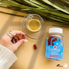 Витамините IVYBEARS BOOST ENERGY са създадени, за да осигурят допълнителна енергия и повишена концентрация по естествен начин. Формулата съдържа високи дози таурин, кофеин, витамин B6 и витамин B12, които имат ободряващ ефект върху ума и тялото. Тези съставки намаляват симптомите на умора, като същевременно подобряват продуктивността и поддържат нормалния енергиен метаболизъм.