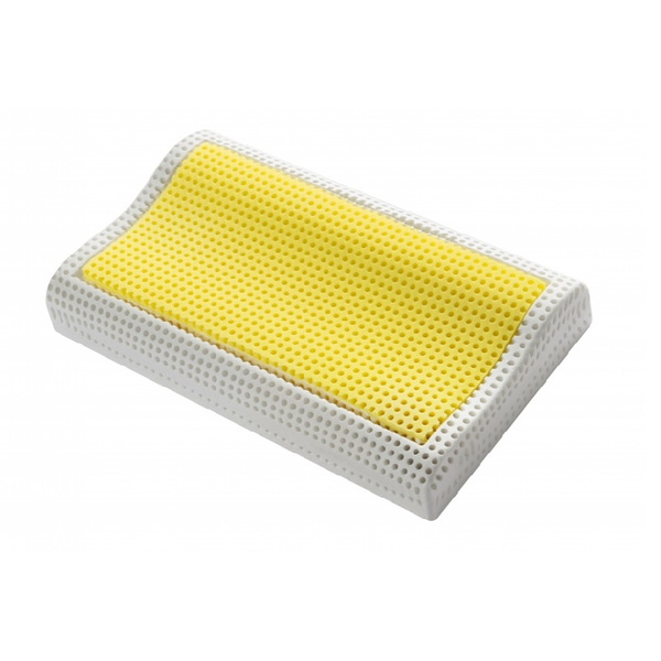 Възглавница AIR YELLOW CERVICAL е съставена от 100% мемори пяна и е с анатомична извивка. Тя е със сменяема калъфка с цип, състои се от два слоя мемори пяна, като вътрешния жълт слой е средно мек с антибактериална обработка и противоакарно въздействие.