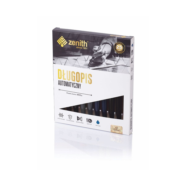 Елегантна, метална химикалка; Изработена от най-висококачествен материал; Дължина на линията за писане 4 500 метра; Сменяемо голямо отделение Zenith 4 със синьо мастило с гарантиран дълготраен цвят; Цветове: тъмно синьо, черно, сиво, бежаво, зелено, червено и виолетово.
